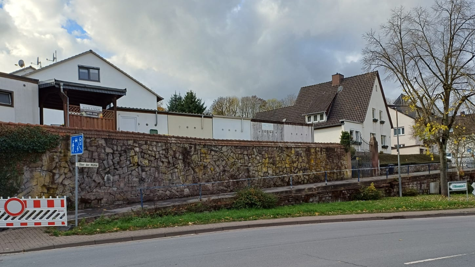 Aufgrund von beschädigten Mauerelementen im Einfahrtsbereich der Straße „Über der Mühle“, von der „Hoopstraße“ kommend, ist die Stabilität des Straßenabschnitts